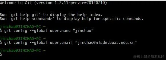首先打开之前安装的”Git Bash“(Git安装后的一部分),输入”ssh-keygen -t rsa -C "jinchao@nlsde.buaa.edu.cn"“,把里面的