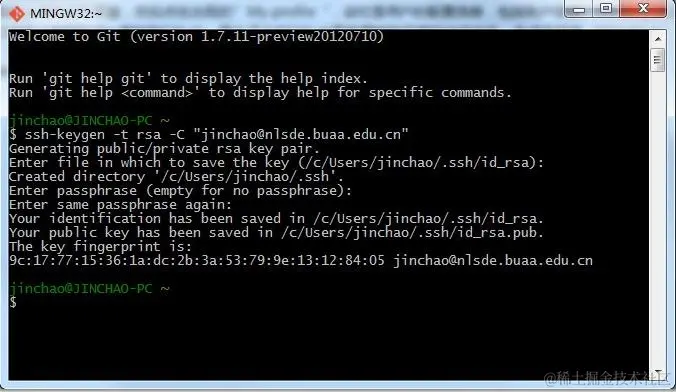 jinchao@nlsde.buaa.edu.cn改成自己的注册邮箱地址,然后一直敲回车就行,下图是我电脑生成SSH Key的情况: