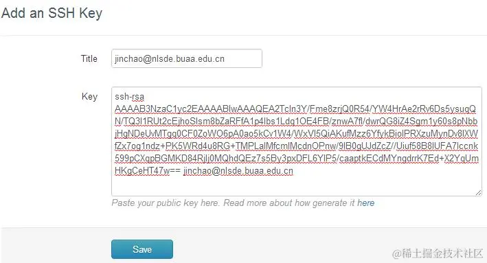 生成SSH Key之后,到自己电脑下的C:\Users\<用户名>\.ssh文件夹下id_rsa.pub文件中的内容复制到“Key”的文本框中,点击保存。