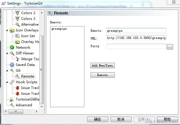 然后点击之前图中的“Manage”,在出现的图中点击左边”Git“选项下的“Remote”,即远程地址,输入Remote名(可随意),然后
