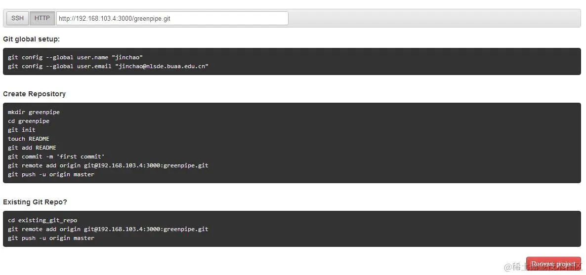 6、我们得先获取新建的项目在GitLab上的地址,查看之前的web页面,点击最上面的HTTP,该地址就是该新建项目的地址。