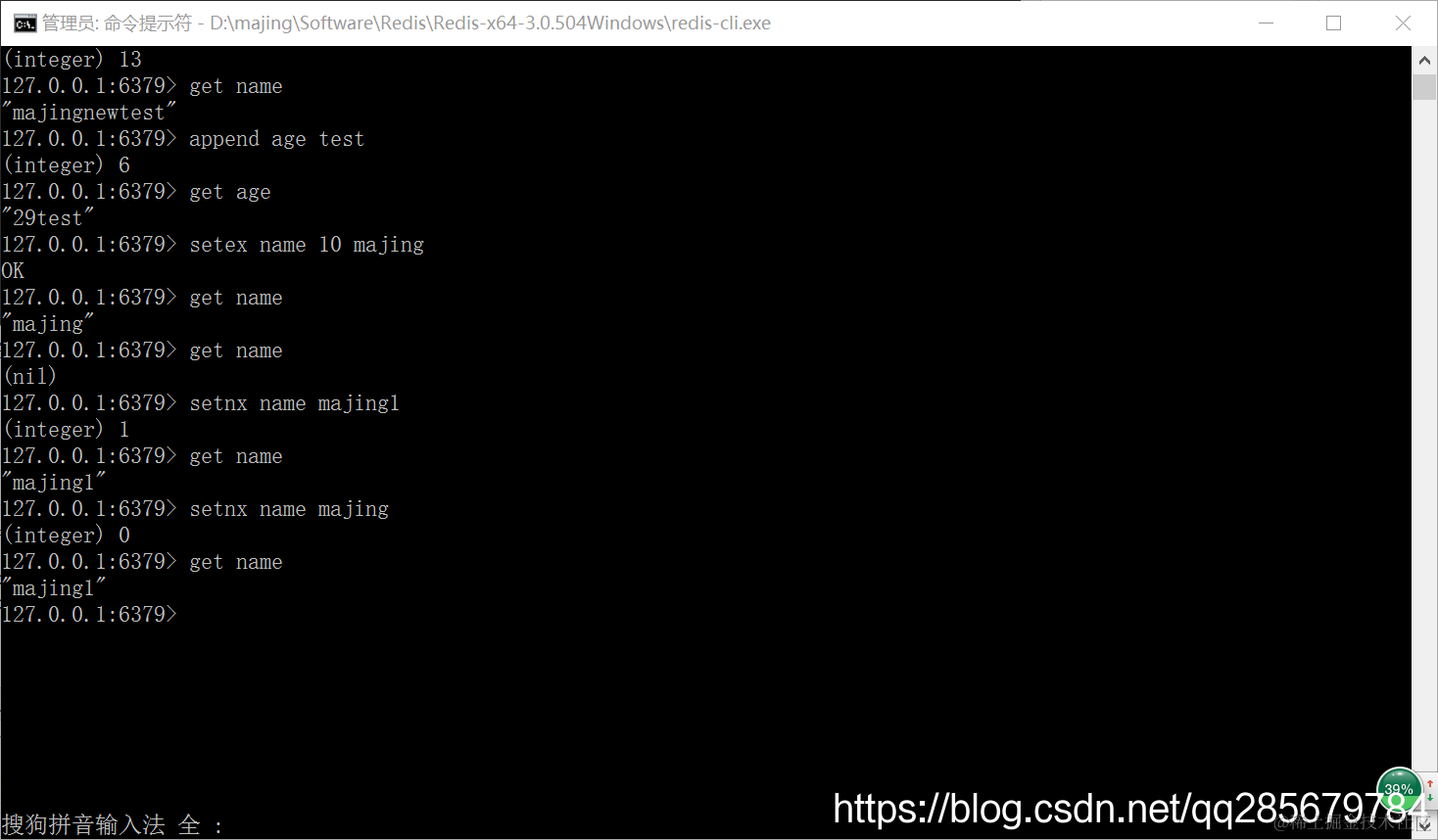 除了上面的命令,还有几条命令,首先有两个命令比较常用,setex 和setnx,作用如上面的第8条和第9条含义描述所示,下面简单在控制台操作了下,方便理解: