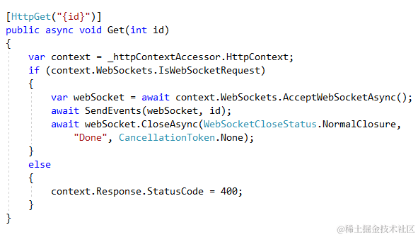 这里需要注入HttpContextAccessor. 然后判断请求是否是WebSocket请求, 如果是的话, 客户端会收到回复, 这时Socket就升级完成了. 升级完返回一个webSocket对象, 然后我把events通过它发送出去. 随后我关闭了webSocket, 并指明了原因NormalClosure.
