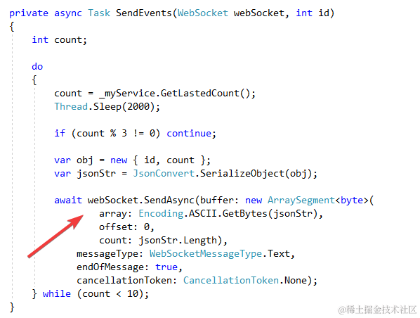 这里的重点就是webSocket对象的SendAsync方法. 我需要把数据转化成buffer进行传送. 数据类型是Text. 具体参数请查看文档.