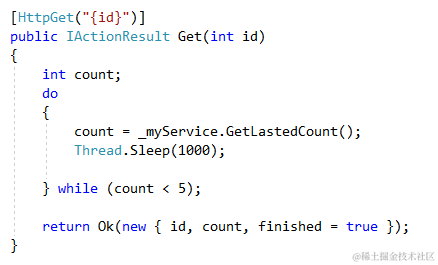 Controller里面的代码意思是: 如果Count > 6 就返回一个对象, 里面包含count的值和传进来的id; 如果 count > 10, 还要返回一个finished标志.