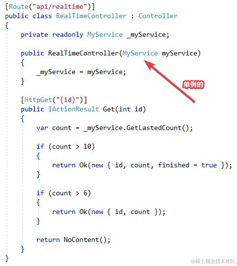 就看这个Controller的Get方法即可. 用到了MyService, 它在项目里是单例的. 它的方法非常简单: