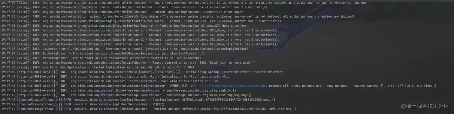 @StreamListener : 它主要定义在方法上, 作用是将被修饰的方法注册为消息中间件上数据流的事件监听器,配置文件中提到注意输入通道, 注解中的属性值对应了监听的消息通道名, 在上面的例子中,我们通过 @StreamListener(StreamConstant.DEMO_TEST) 注解将onConsumer方法注册为input消息通道的监听处理器,所以当我们向RocketMQ的中发布消息的时候,该方法会做出对应的响应动作。