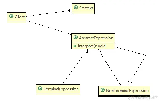 AbstractExpression: 抽象表达式, 声明一个抽象的解释操作,这个方法为抽象语法树中所有的节点所 共享