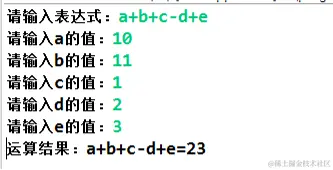 先输入表达式的形式,比如 a+b+c-d+e, 要求表达式的字母不能重复 在分别输入a ,b, c, d, e 的值 最后求出结果:
