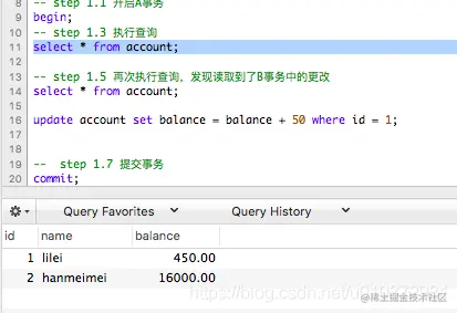 事务A开启事务后,执行查询语句,此时数据为450