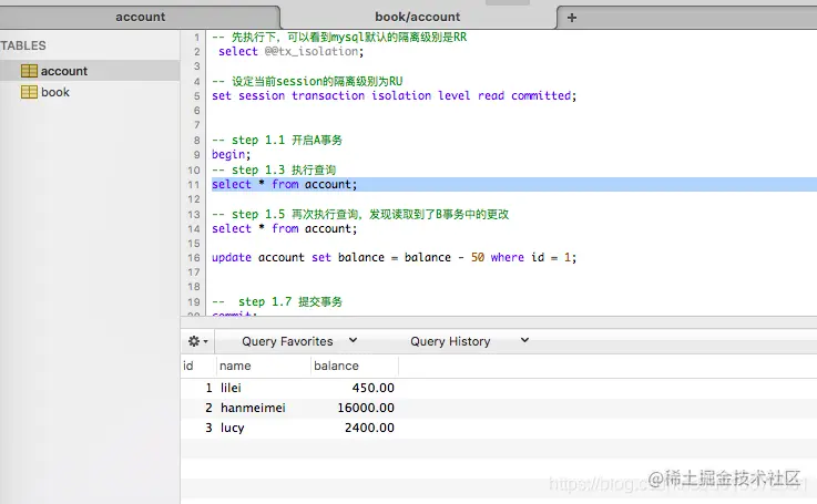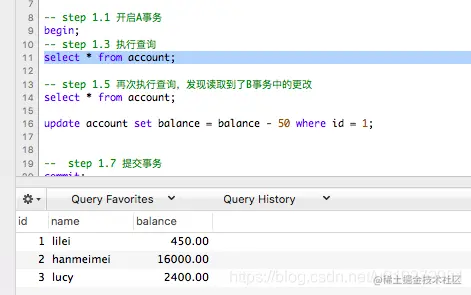 事务A中再次执行查询,会发现数据仍为450,这就表示没有出现上面读未提交隔离级别中,读到事务B未提交的数据的情况