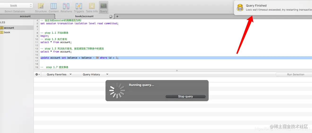 事务B一直不提交,那么事务A最终会锁超时,如下图所示