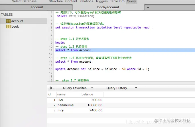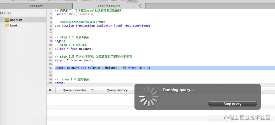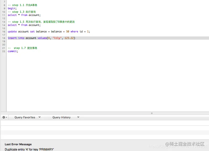在第一个窗口中执行下面的语句(注意两个窗口,都按照注释中的step一行一行执行)