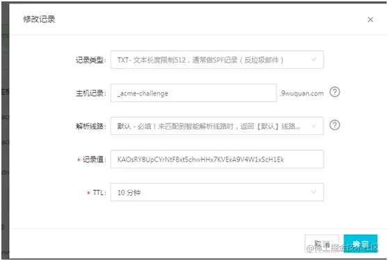 显示我两个主机的 TXT 记录有两条,根据要求分别在 DNS 解析中添加两条 TXT 记录,其中一条如下:_acme-challenge