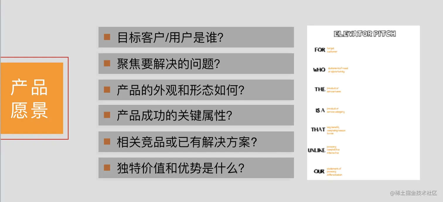 电梯演讲假设的场景,就是我们在电梯上偶遇公司管理层,能否在有限的时间内给对方讲清楚我们在做的事情,比如中台。这就要求我们做到足够的收敛。因此电梯演讲的形式,主要是限定了几个产品最关键因素,比如用户是谁,解决什么问题,差异化特点是什么等等。其中每一个要素都非常重要,如果你回答不出来,或是团队的回答不一样,就在一定程度上体现出大家对于中台建设的愿景还没有达成一致,也就为后续各种问题的出现埋下了祸根。