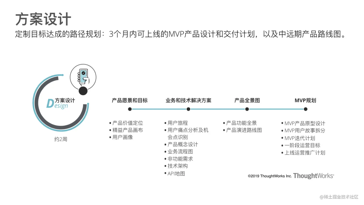 第三个阶段是 Design,帮助我们针对实施路径中的某一个产品,例如业务中台,做详细的设计,包括产品级的业务需求分析、功能及架构设计、实施计划等