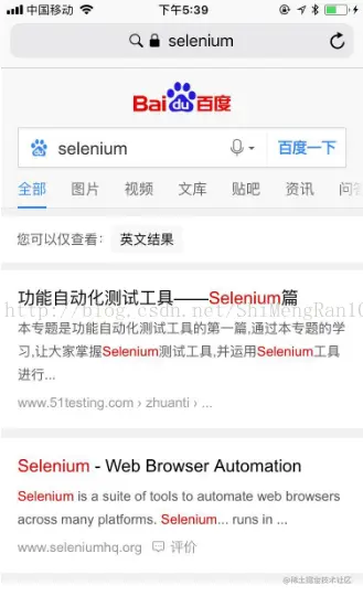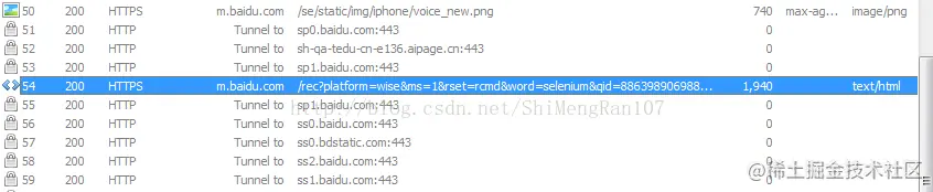 打开手机的浏览器,使用百度,输入“selenium”百度一下。查看Fiddler上的有请求数据。