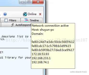 打开Fiddler,右上角有一个Online,这里也可以查看IP。如果和电脑的ip不一致时,以这里的为准。