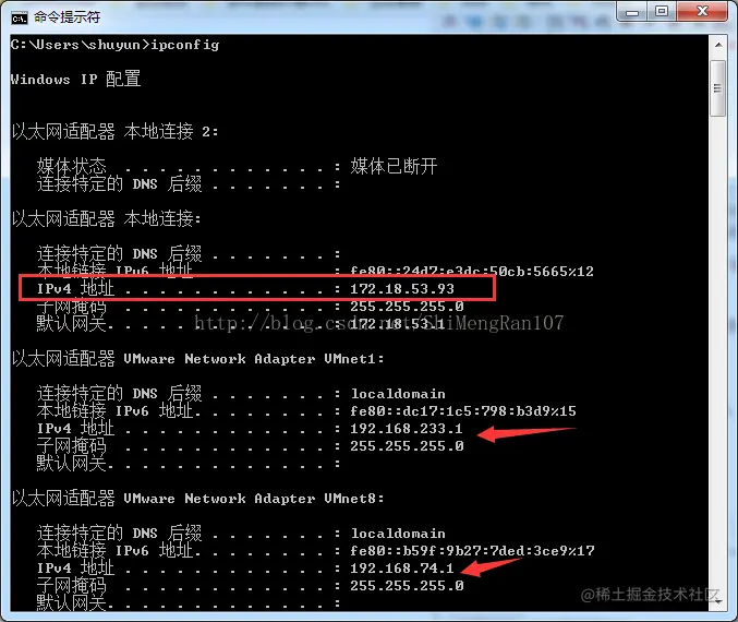 查看本机的ip地址,在本机命令行输入:ipconfig 我的电脑有3个IP,都试了一下,172.18.53.82是有效的IP,其余2个是虚拟机的IP