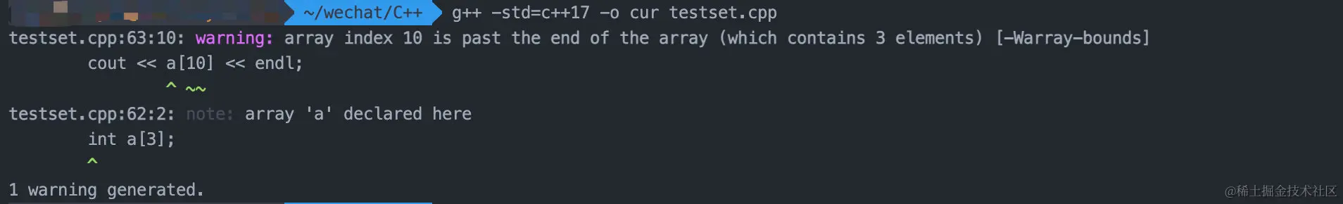 在上面的例子当中,我们声明了一个长度为 3 的数组,但是访问了下标 10。这显然超出了数组的范围,但是当我们编译的时候编译器并不会报错,只会抛出一个警告。要知道程序员往往是看不见警告的。