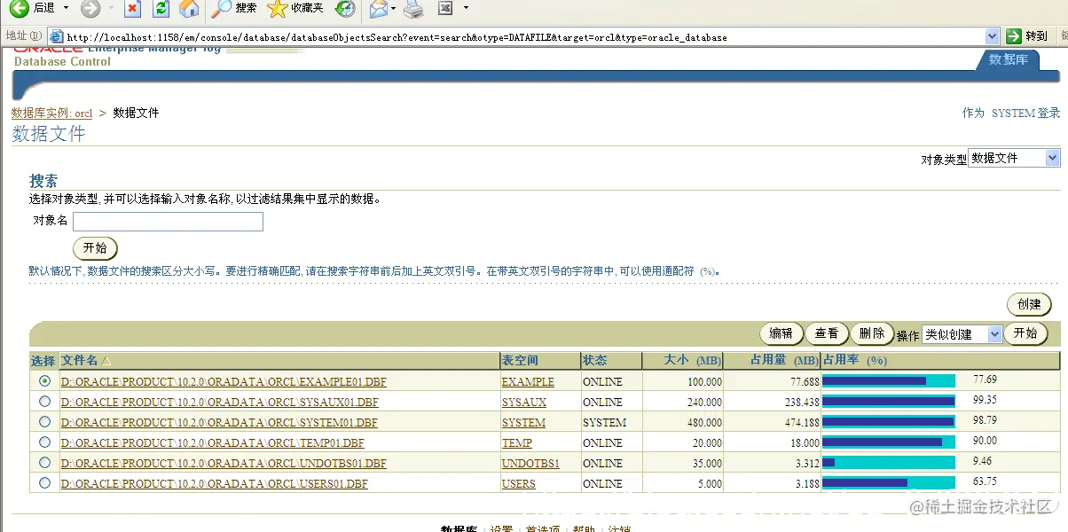 1.分别使用SQL命令和OEM图形化工具查看本地数据库物理文件,并使用OEM工具在现有的usrs表空间中添加user02.dbf数据文件。
