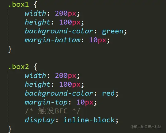 下面我们让其中一个盒子触发BFC,从而达到间隔 20px 的期望效果: