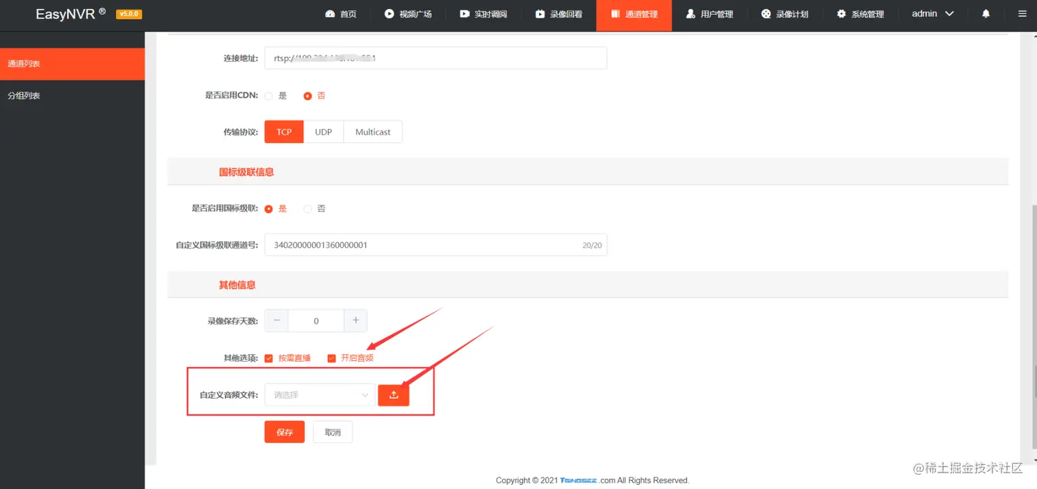 将获取的AAC音频文件在EasyNVR的通道管理页面进行添加,如下图: