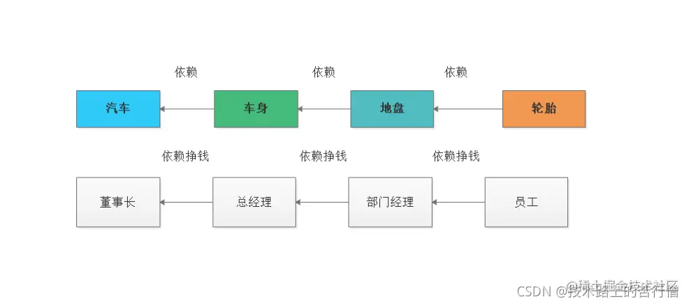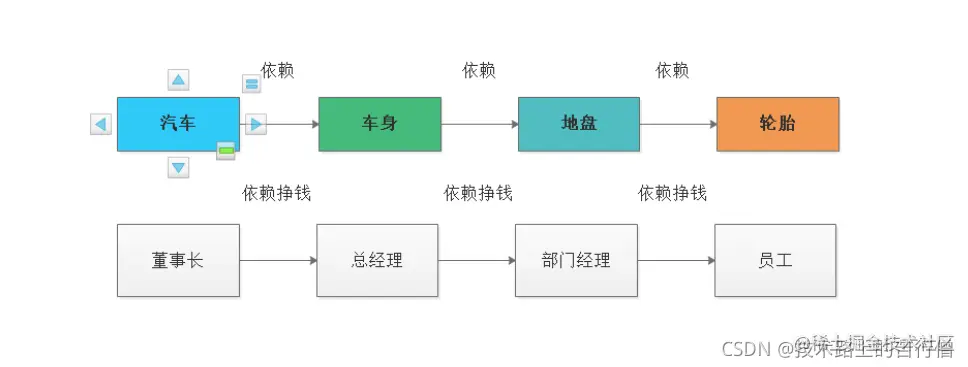 上图看上去没有什么毛病?但是 万一轮胎尺寸改了,那么地盘需要改,地盘改了,车身也改了,让后整个汽车构造都改了. 然后汽车公司倒闭了...................... 董事长依赖总经理争取,总经理依赖部门经理挣钱,部门经理依赖员工争取,那么员工离职了怎么办? 反过来.............................假如汽车公司决定修改轮胎的 我们就只需要改动轮子的设计,而不需要动底盘,车身,汽车 的设计了。