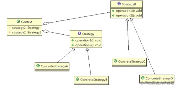 从上图可以看到,客户context 有成员变量strategy或者其他的策略接口 ,至于需要使用到哪个策略,我们可以在构造器中指定.