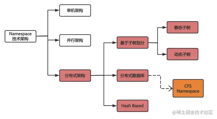 当前,业界分布式文件系统领域衍生出各种类型的 Namespace 技术架构,可以归类为如下几种: