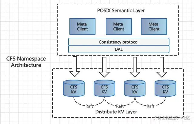 基于分布式 KV 架构,CFS 采用自研的分布式索引系统来支撑 Namespace 子系统,并基于该索引系统实现了分层架构,即 POSIX 语义层+分布式 KV 层。该索引系统经过 CFS 产品多年的打磨,目前可以非常好地解决 Namespace 层级结构扩展性与低延迟的需求。