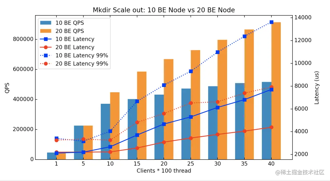 以下数据对比了10个 KV 节点和20个 KV 节点在并发 mkdir 的性能数据表现(图中 BE 对应分布式 KV 层一个后端 KV 节点):