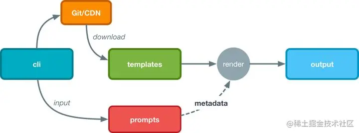 要开发脚手架,首先要理清思路,脚手架是如何工作的?我们可以借鉴 vue-cli 的基本思路。vue-cli 是将项目模板放在 git 上,运行的时候再根据用户交互下载不同的模板,经过模板引擎渲染出来,生成项目。