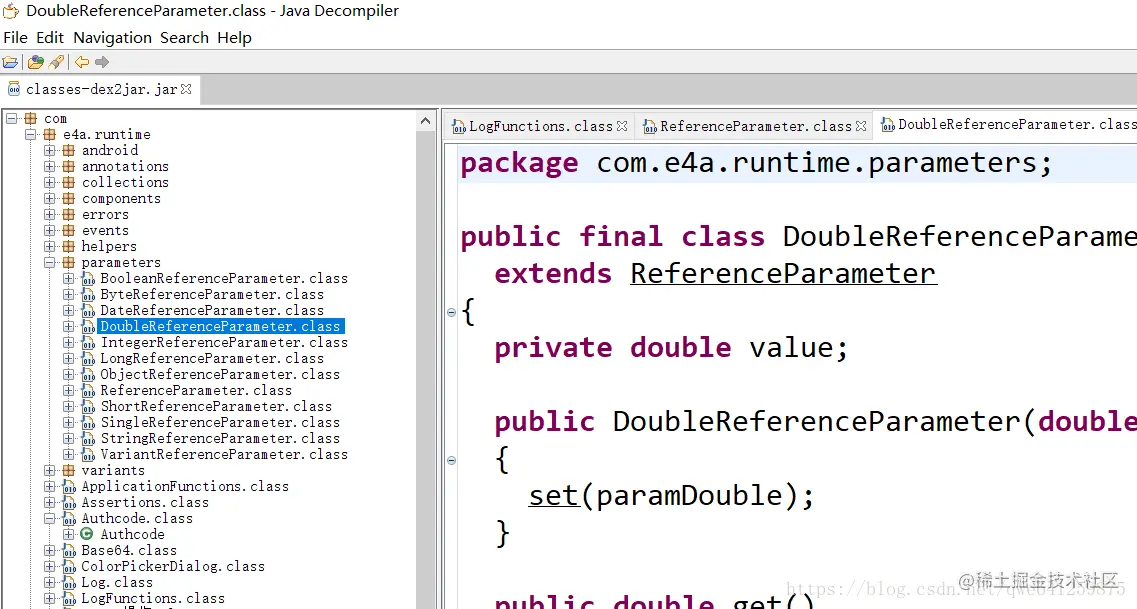 在该目录下会生成一个classes_dex2jar.jar的文件,然后打开工具jd-gui-windows-1.4.0文件夹里的jd-gui.exe,然后用该工具打开之前生成的classes_dex2jar.jar文件,便可以看到源码了,效果如下:
