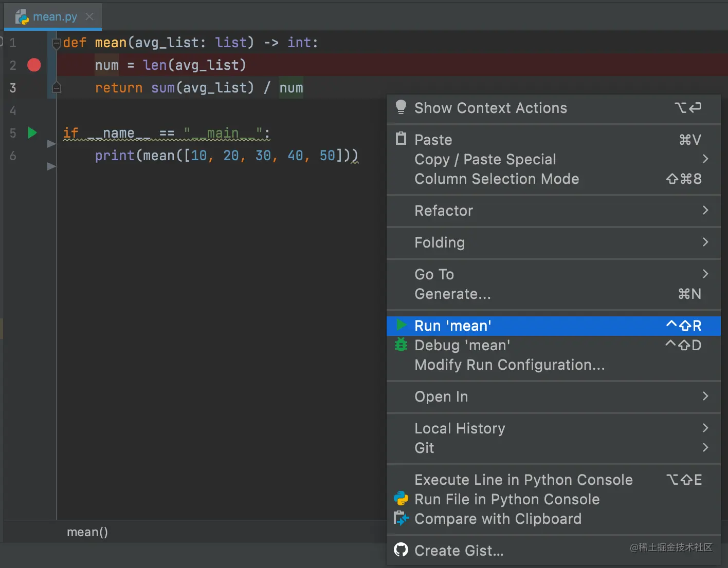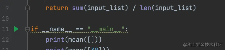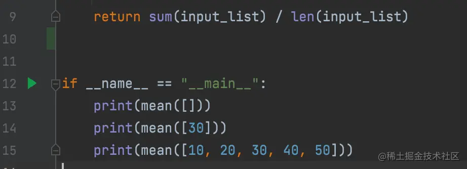 def mean(input_list: list) -> float: """ 平均数 input_list: list[int] 数值型数据列表 returns: float: 平均值 """ if not input_list: return 0 return sum(input_list) / len(input_list)if __name__ == "__main__": print(mean([])) print(mean([30])) print(mean([10, 20, 30, 40, 50]))