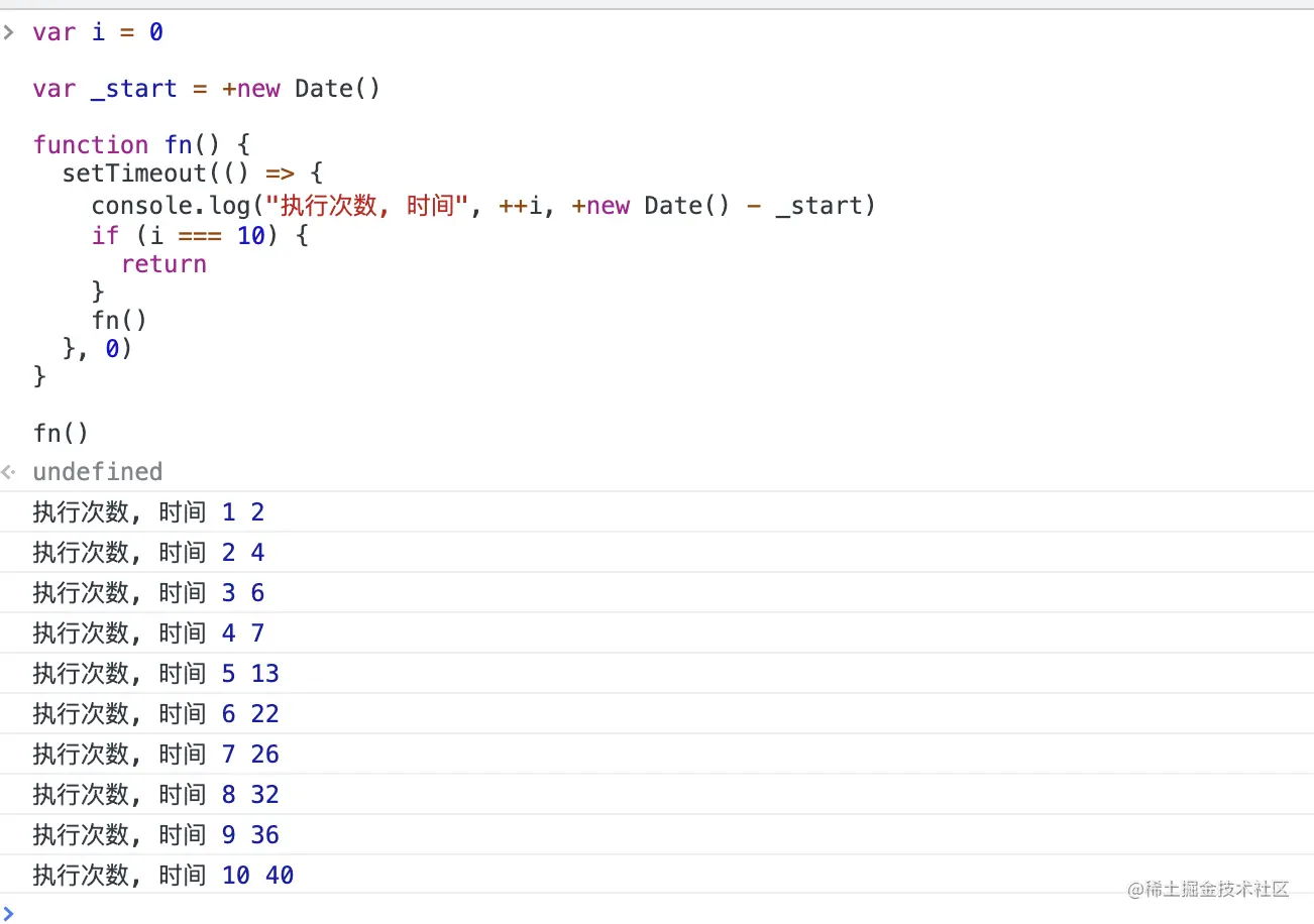 console.log("执行次数, 时间", ++i, +new Date() - _start)