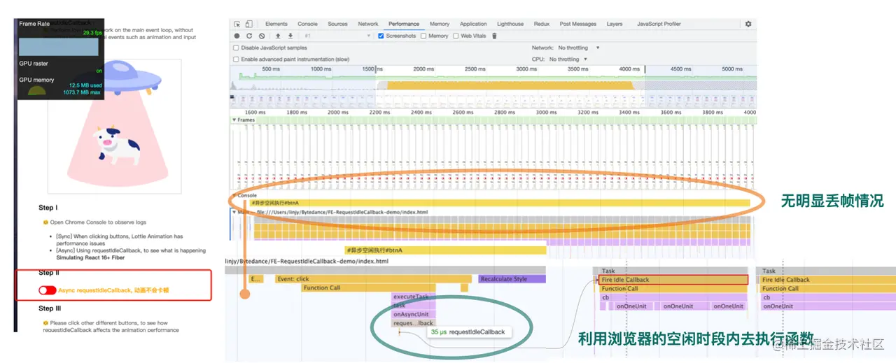- 实验结论: requestIdleCallback FPS只有20ms,正常情况下渲染一帧时长控制在16.67ms (1s / 60 = 16.67ms)。该时间是高于页面流畅的诉求。