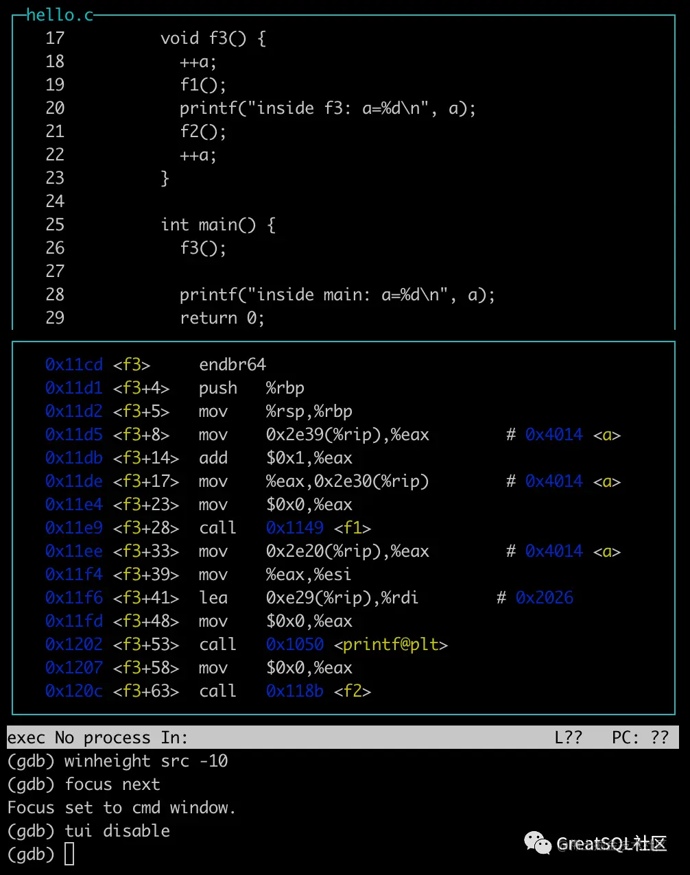 某些情况下,可能需要查看汇编代码、查看寄存器值等信息,可以使用:Ctrl+x后按2,进行切换,按同样按键可以在继续进行切换,效果如下: