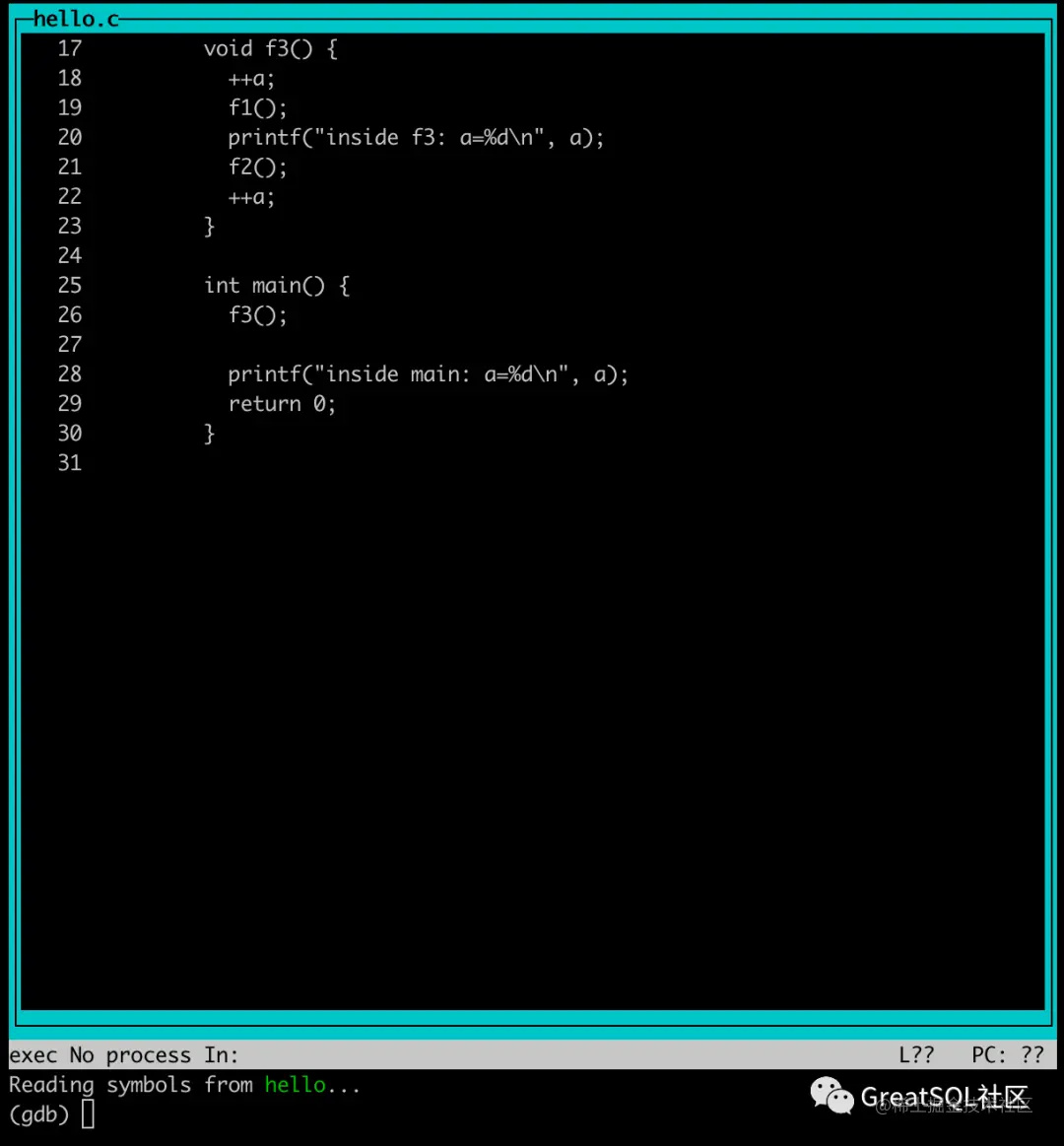 GDB是在MySQL调试时最常使用到的调试工具,在终端界面(TUI, Text User Interface)模式下, GDB可以和Visual Studio或者CLion一样像IDE一下显示和跟踪代码。