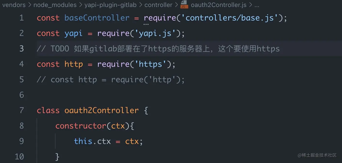 我们将文件 yapi安装目录下的vendors/node_modules/yapi-plugin-gitlab/controller/oauth2Controller.js 顶部引入的http换成https就可以了;修改完成之后要重启一下服务器。