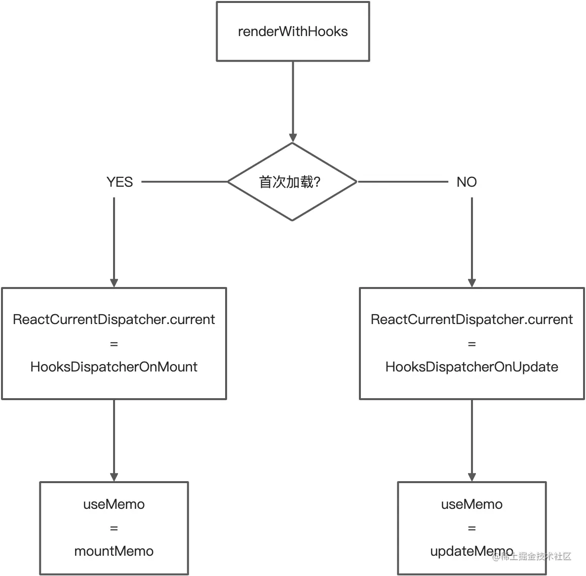 为了更直观地看出 useMemo 在首次加载和更新时的处理逻辑,我们将上面的等式转换成流程图,如下: