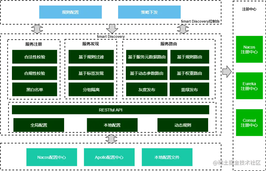 Smart Discovery旨在对SpringCloud服务注册发现功能进行增强,提供一个可基于规则的服务注册发现、路由的智能微服务治理框架,基于此种灵活的规则配置可实现如服务注册校验、分组隔离、权重路由、主机路由、自定义标签路由、动态参数路由、灰度发布、黑白名单等业务场景。同时框架适配了主流的注册中心、配置中心,依托于配置中心的能力实现配置规则的动态下发。
