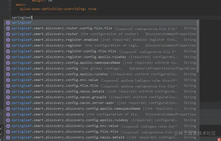 server: port: 18080 spring: application: name: demo-a cloud: nacos: discovery: server-addr: localhost:8848 metadata: #配置更多的服务元数据,smart discovery基于此元数据进行路由(此示例中基于version路由) version: 1.0 # region: dev # tag: tag1 springleaf: smart: discovery: router: config: file: file: classpath:discovery-rule-discovery.json #采用file配置方式,并指定配置文件路径,更多参见规则配置说明章节 logging: level: com: springleaf: debug #为方便验证结果,打印smart discovery日志另外,得益于Spring的 spring-configuration-metadata 功能,针对框架相关的参数配置在idea开发环境下都可以通过诱导提示,包含参数说明、是否必填、示例等信息,如下: