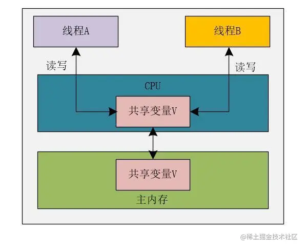 例如,上面的图中,由于CPU是多核的,线程A操作的是CPU-01上的缓存,线程B操作的是CPU-02上的缓存,此时,线程A对变量V的修改对线程B是不可见的,反之亦然。