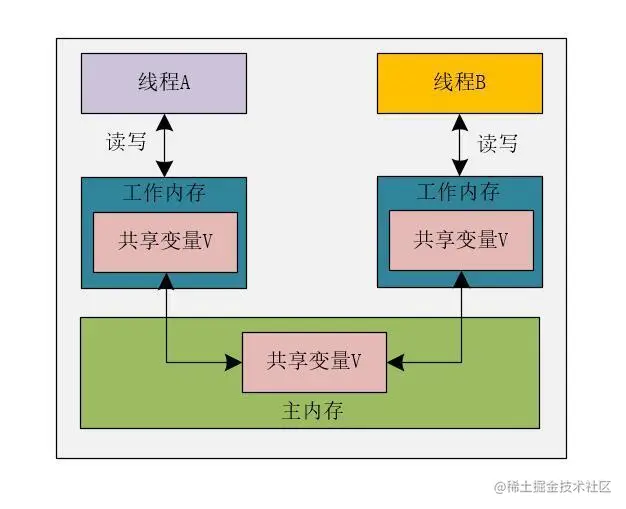 使用Java语言编写并发程序时,如果线程使用变量时,会把主内存中的数据复制到线程的私有内存,也就是工作内存中,每个线程读写数据时,都是操作自己的工作内存中的数据。