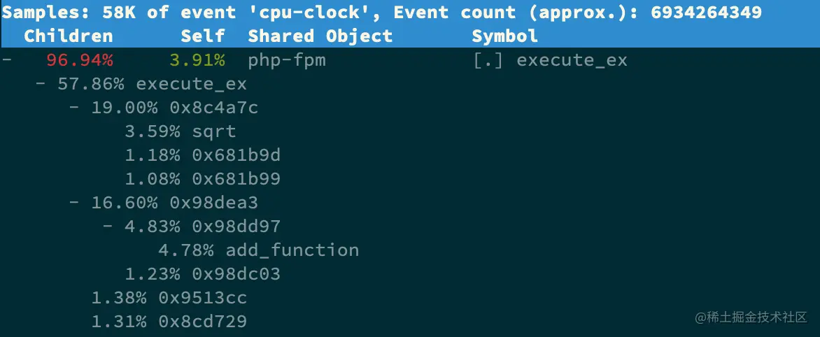 第三个,进程 CPU 使用率升高的案例。我们先用 top ,查看了系统和进程的 CPU 使用情况,发现 CPU 使用率升高的进程是 php-fpm;再用 perf top ,观察 php-fpm 的调用链,最终找出 CPU 升高的根源,也就是库函数 sqrt() 。