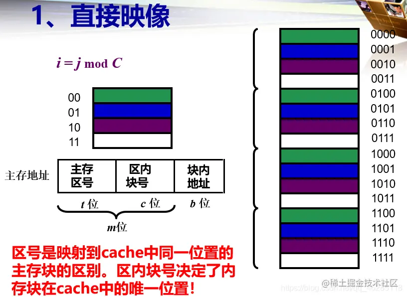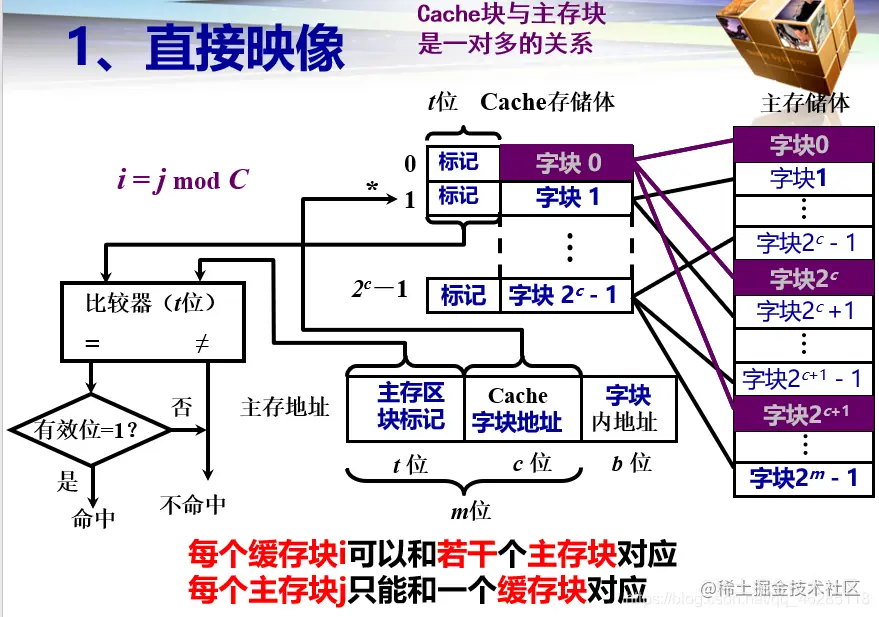 直接映像:某一主存块只能映像到唯一缓存块。映像方式简单,但是不够灵活,容易导致块冲突