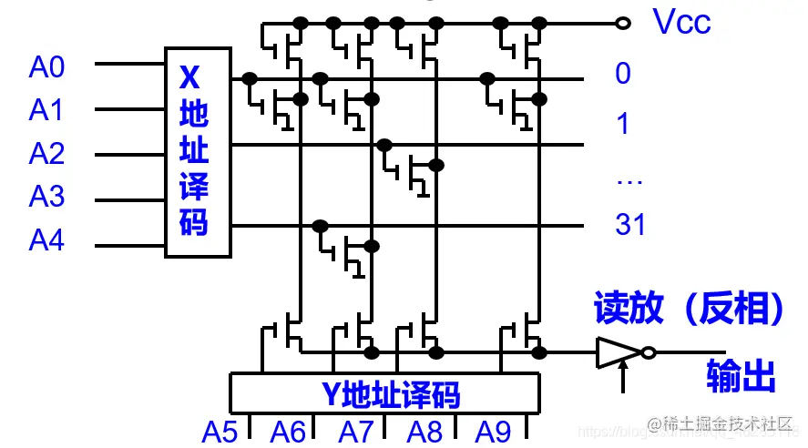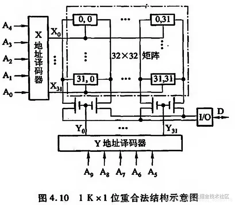 需要X,Y两个方向各32根选择线,构成一个32×32的矩阵。当地址线全为0,译码输出X0和Y0有效,矩阵中第0行,第0列被选中。