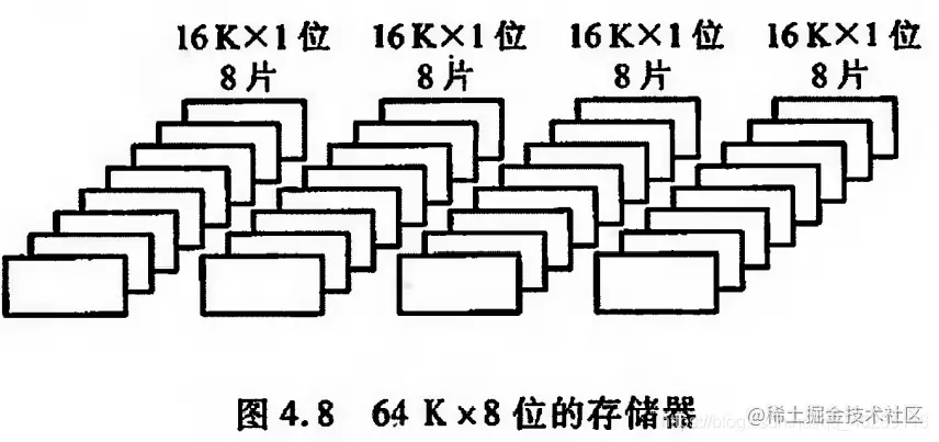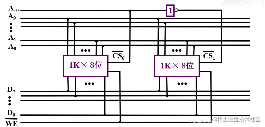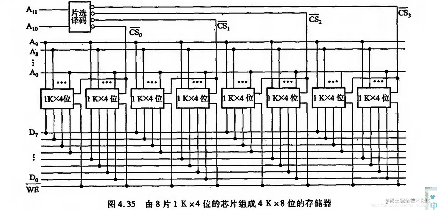 字、位扩展: 既增加存储字长又增加存储字的数量。例如用8片1K×4位组成4K×8位。