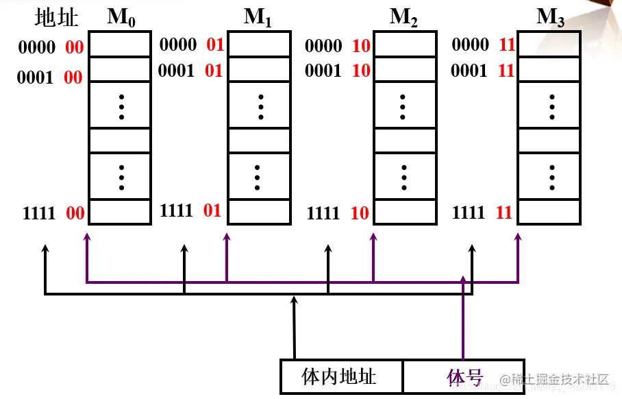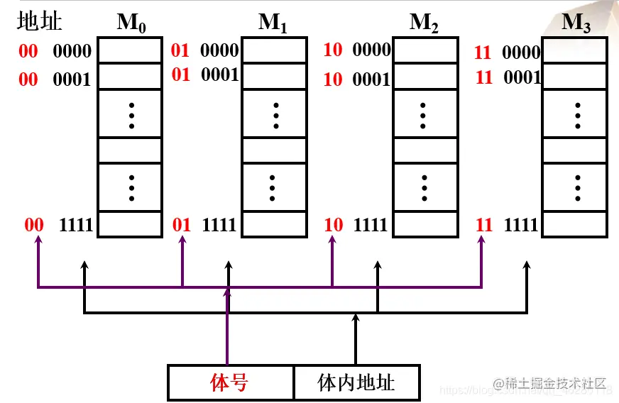 高位交叉编址方式:存储体的编址方式为顺序存储,即一个存储体存满后,再存入下一个;存储单元地址的高位为存储体的编号。